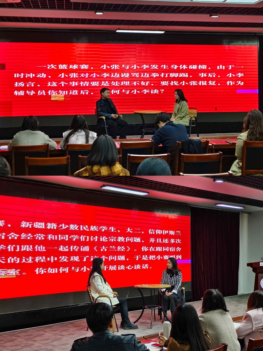 辅导员谈心谈话实战演练环节,辅导员代表孙亚红、李小芬针对人际关系冲突以及少数民族宗教信仰问题进行谈心谈话现场模拟;自由交流环节,郭志凤与现场辅导员就辅导员工作室的发展及提升育人实效等问题进行了热烈讨论,强调辅导员工作应坚守教育初心,注重反思复盘。在场辅导员都得到了不同程度的感悟与收获。